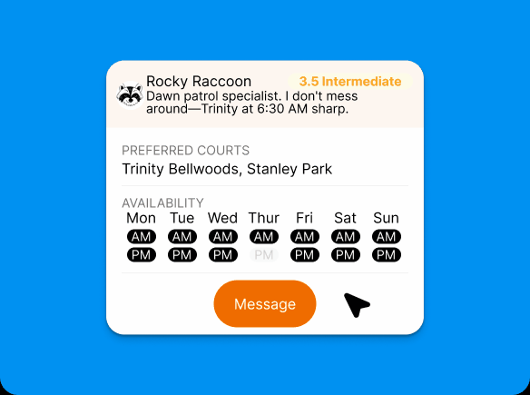 Check your partner's schedule, chat to coordinate, and book your game—simple as that. Less planning, more playing.