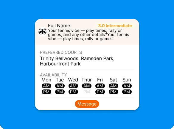 Match with local tennis players based on skill level, court location, and schedule. Join a growing community that loves to rally.